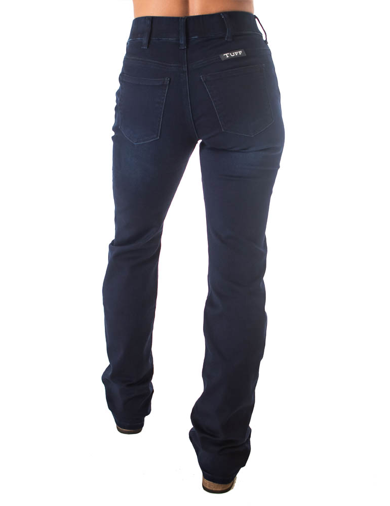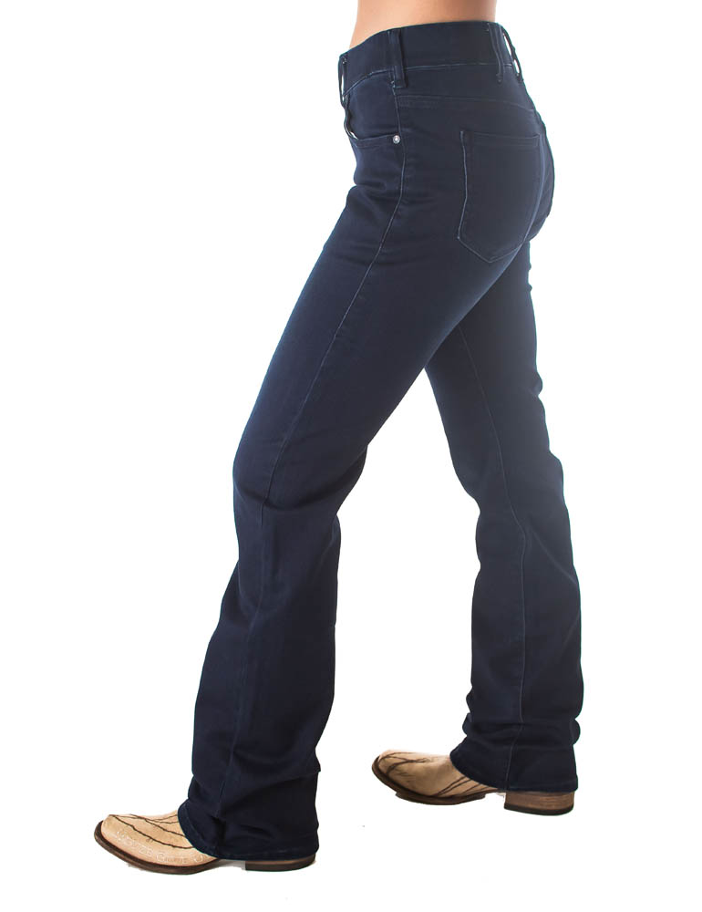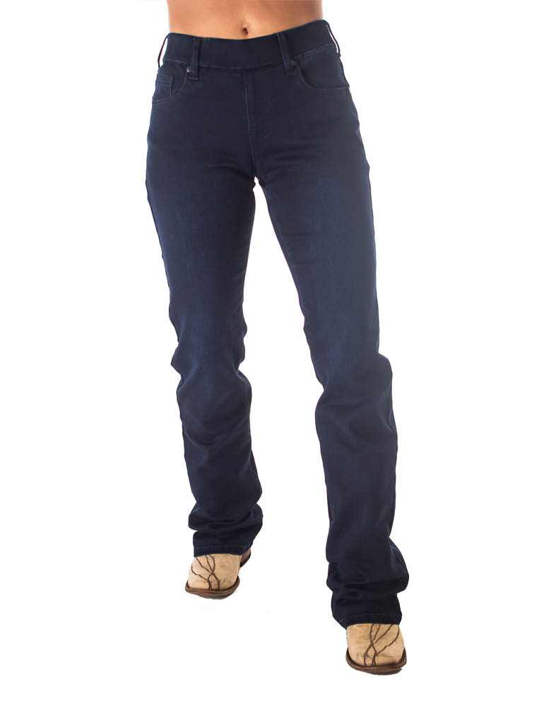 These are definitely NOT your grandma's jeans. I'm so excited about my new pull-on style jeans because they are so flattering on all body shapes and unbelievably comfortable, you'd swear you were wearing your favorite leggings. But because they are made from our premium dark wash, Tuff Flex stretch denim, they are so sleek and classy no one will ever know how cozy you really are. I designed this new fit for a few reasons. First of all for total comfort for ladies that work in the office and sit at their computers all day. Secondly for anyone who wants to feel amazing in their jeans without the tightness of a button and zipper. And thirdly for our cowgirl fans that have gotten their open zipper jeans hooked on the horn. Yes, ladies it happens to even the best riders and it can be scary.